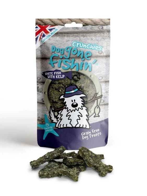 Dog Gone Fishin’ White Fish Crunchies with Kelp are a deliciously crunchy fish treat.