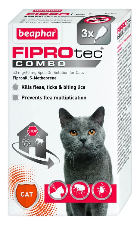 Beaphar FIPROtec® COMBO Spot On for Cats contains fipronil and the insect growth regulator S-methoprene. It which not only kills adult fleas, ticks and biting lice, but also interrupts the flea life cycle, preventing any exposed eggs and/or larvae from developing in your home for up to six weeks.