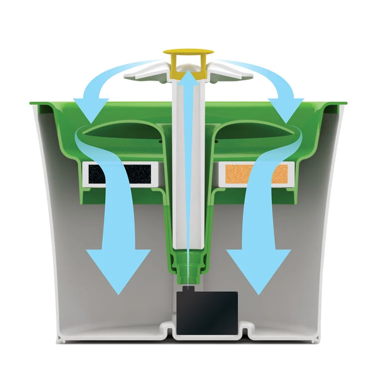 The flower is easy to add to (or remove from) the fountain. Unlike most drinking fountains, the Catit 2.0 Flower Fountain does not have a bowl to drink from, so dirt cannot accumulate in it. All water is filtered before it disappears into the reservoir, guaranteeing fresh drinking water at all times.