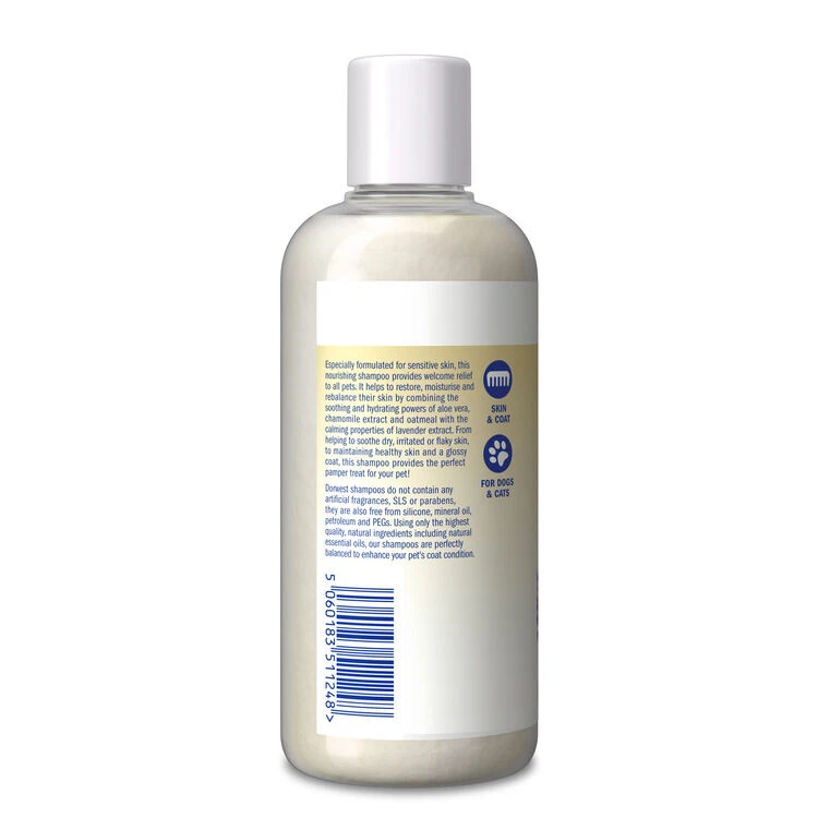 Specially formulated for sensitive skin, this nourishing, natural shampoo for dogs and cats helps to restore, moisturise and rebalance. It combines the soothing and hydrating powers of aloe vera, chamomile extract and oatmeal with the calming properties of lavender extract. A neutral pH ensures this shampoo works harmoniously with your pet’s skin and by using no artificial colours, fragrances or chemical foaming agents, it’s both natural and hypoallergenic. From helping to relieve dry, irritated or flaky skin, to maintaining healthy skin and a glossy coat, this shampoo provides the perfect pamper treat for your pet.