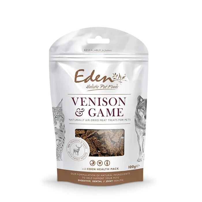 Eden Venison & Game treats are suitable for both cats and dogs, boasting a 70% meat content including, the use of novel game proteins, buffalo, bison and wild boar. Not only do these meats allow for a luxurious and exotic taste but also provide excellent nutritional value, and are a great choice for pets with sensitive stomachs. Our treats have been gently air-dried to retain all of their natural nutrients and flavour. The treats are put on a bespoke drying system which slowly and carefully starts to remove the moisture from the raw ingredients, producing a compact succulent treat that is extremely pliable, allowing them to broken into smaller pieces for smaller mouths.