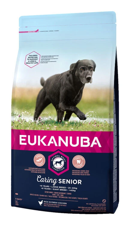 New and improved EUKANUBA life stage recipe, for large sized caring senior dogs aged +9 years provides tailored nutrition to support your senior dog’s optimal body condition and active mobility. Our senior recipes are rich in fresh chicken for a tasty recipe, and provide a high quality source of protein, to ensure that your senior dog can be the best they can be. Our uniquely tailored large sized senior recipe contains a tailored fibre blend with prebiotic FOS and beet pulp to help support a healthy digestion, calcium to support strong bones, glucosamine and chondroitin to help maintain healthy joints, natural sources of Omega 6 and 3 for a healthy skin and shiny coat, plus, l-carnitine to help weight management and antioxidants vitamin E & C to help support their immune system. Our unique hexagon kibble shape together with DentaDefense also helps to keep teeth clean and healthy. Advanced nutrition for large sized senior dogs to support optimal body condition and lifelong wellbeing.