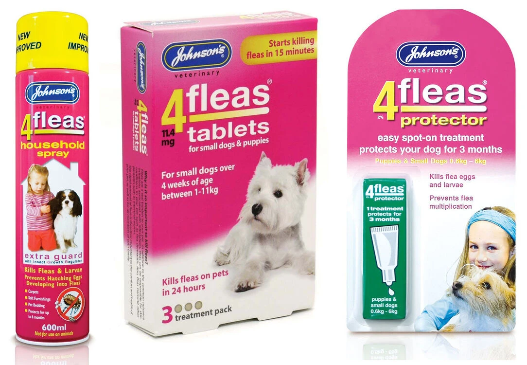 Johnson’s 4Fleas Dog Tablets (3 treatment pack)Â – Containing enough inside each pack to provide 3 treatments, these tablets begin to kill flees within the first 15 minutes of being used, and will have completely gotten rid of them within 24 hours. These tablets are suitable for dogs between 1kg and 11kg.