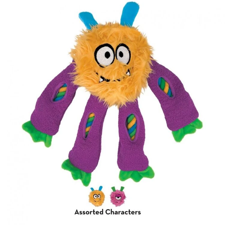 Sneakerz Knots’ sturdy internal rope features a rope knot in the head that extends through the legs providing an outlet for appropriate chewing behavior. Unique, peek-a-boo windows pique curiosity and extend the engagement with foraging fun. Long, dangly legs are great for shaking play and a grippy tennis shoe material legs squeak for interactive tugging playtime galore with these grinning pals.