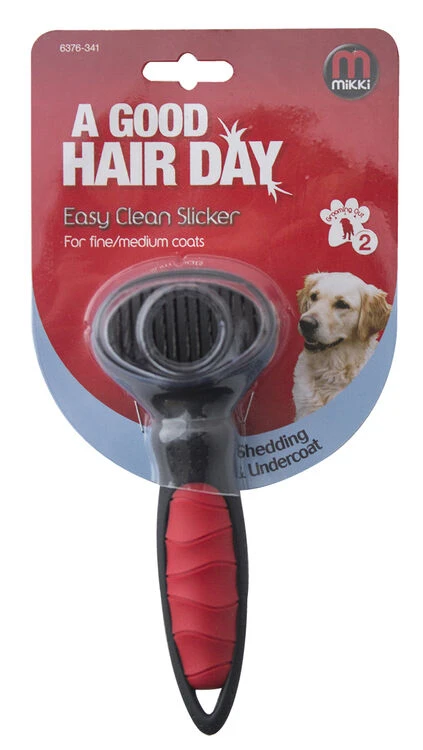 The Mikki Easy Clean Slicker brush is perfect for a natural grooming action, enabling the firm stainless steel pins to work effectively. To make cleaning easy, depress the button to lift dead hair away from teeth.