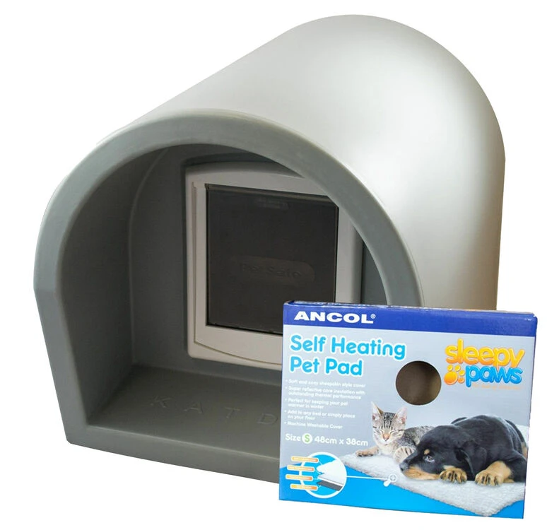 - Kennel, Door & Pet Pad: The KatDen Cat Kennel, a 2-way Petsafe pet door and a fleecy self-heating pet pad